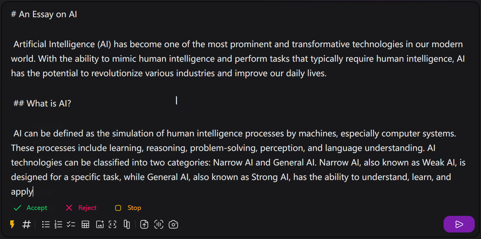 AI可以通过生成额外内容、填补空白或更深入地探索想法来帮助您扩展写作。无论您是在起草文章、创建报告还是写小说,AI都可以分析您现有的文本并建议相关的细节、示例或论点来丰富您的作品。例如,如果您有一个简短的大纲,AI可以通过添加描述、解释和支持信息将其转变为一个完全展开的作品。当您需要详细阐述复杂主题或在不影响写作质量的情况下满足字数要求时,这一功能特别有用。
